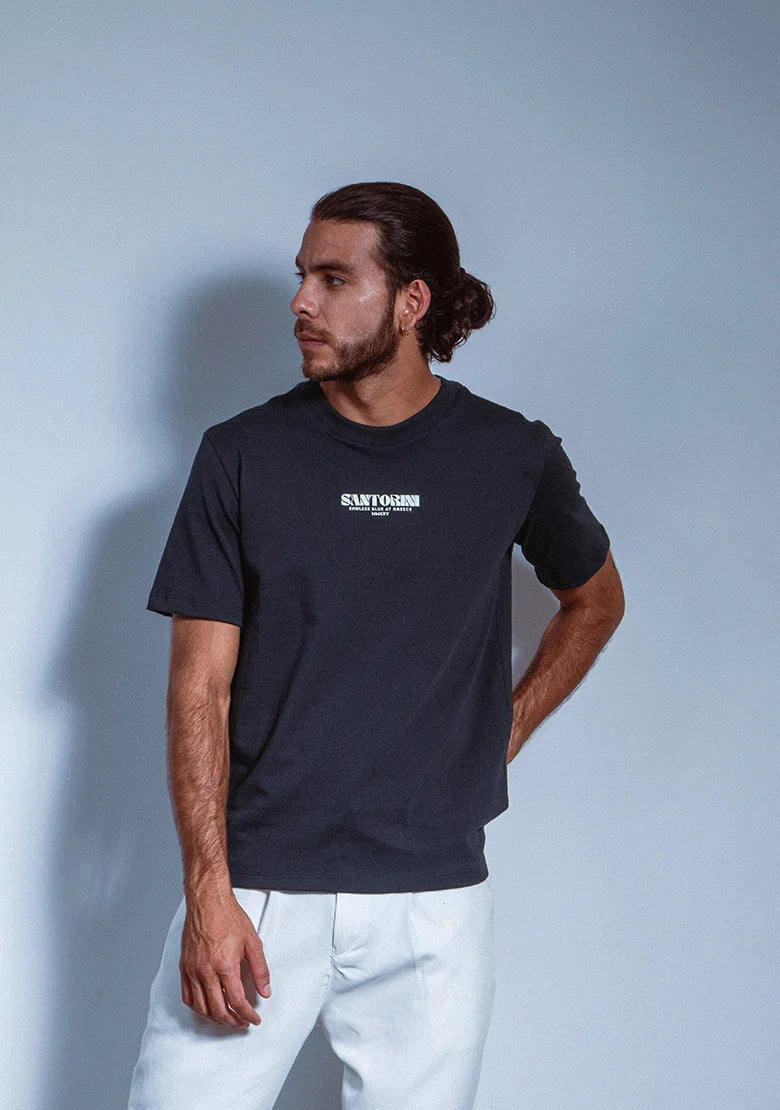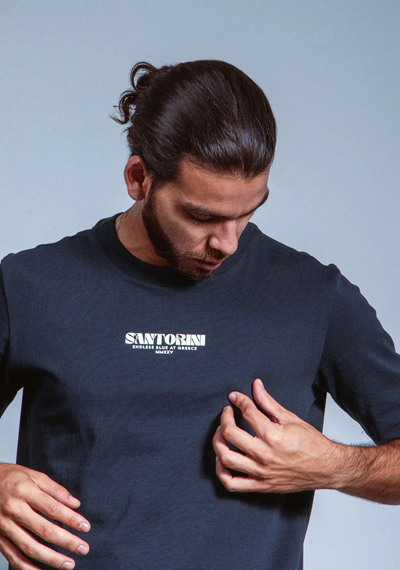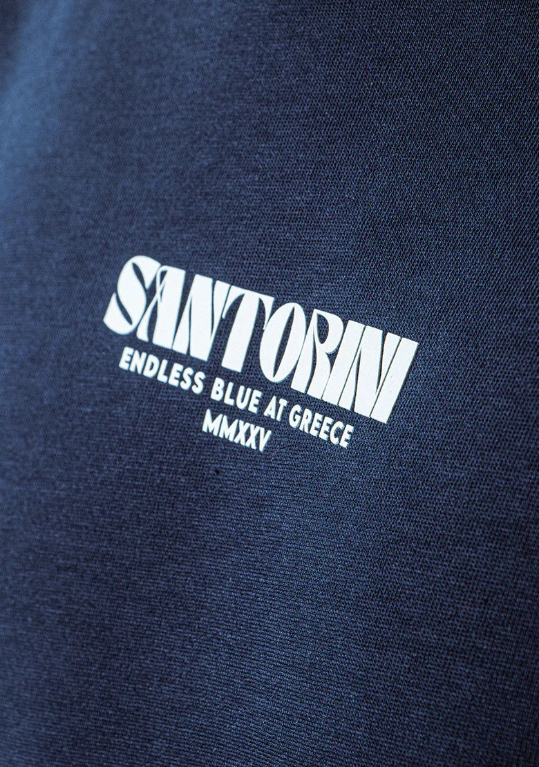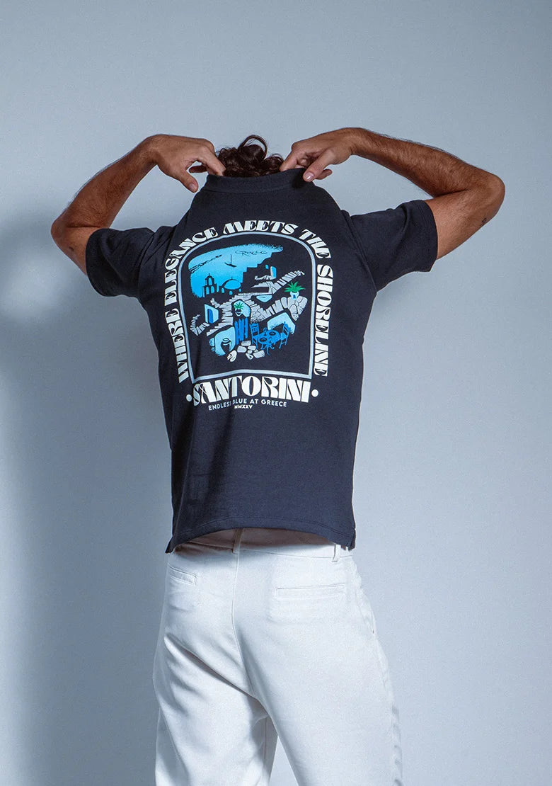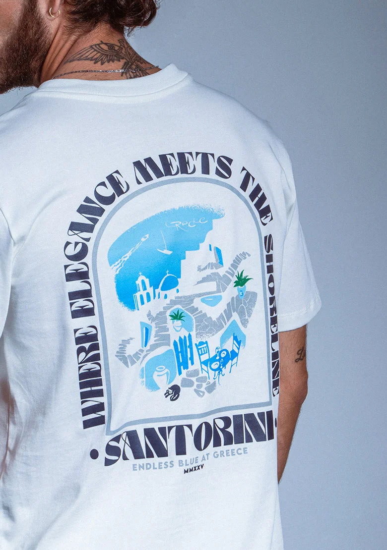 Un diseño limpio que se transforma en arte en la espalda. La ilustración azul captura las estructuras blancas y el encanto clásico de Santorini con un estilo fresco y moderno. Hecha en algodón peruano 270g, con estampados en alta densidad, 3D y policromía impecable que aportan profundidad y brillo.